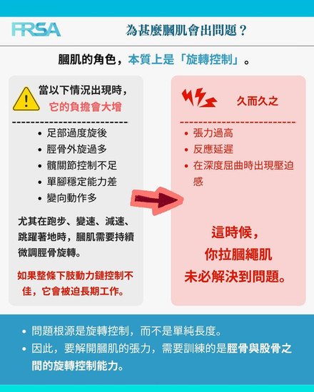 膕肌的主要功能是「旋轉控制」,但當下肢動力鏈的其他部分失衡時,膕肌的負擔會大大增加。以下是常見的問題來源: