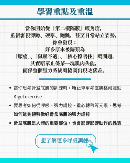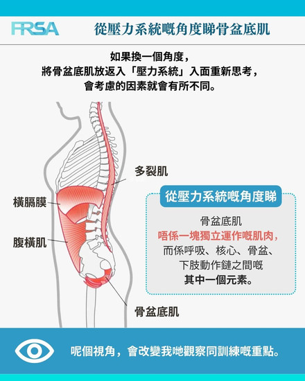 然而,從壓力系統的角度重新審視,骨盆底肌並非獨立運作的肌肉,而是呼吸、核心、骨盆和下肢動作鏈之間的關鍵元素之一。