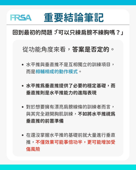 對於想要擁有漂亮肩膀線條的訓練者而言,與其完全避開胸肌訓練,不如將水平推視為垂直推的前置準備。就像我們不會在還沒學會半深蹲的情況下就直接嘗試全深蹲一樣,在還沒掌握水平推的基礎前就大量進行垂直推,不僅效果可能事倍功半,更可能增加受傷風險。