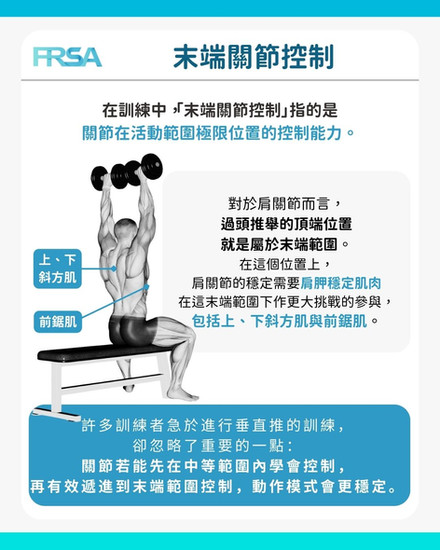 許多訓練者急於進行垂直推的訓練,卻忽略了重要的一點:關節若能先在中等範圍內學會控制,再有效遞進到末端範圍控制,動作模式會更穩定。
