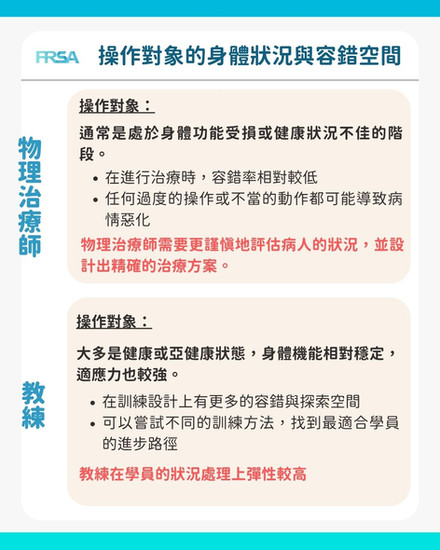 物理治療師面對的病人,通常是處於身體功能受損或健康狀況不佳的階段。這意味著在進行治療時,容錯率相對較低,任何過度的操作或不當的動作都可能導致病情惡化。因此,物理治療師需要更謹慎地評估病人的狀況,並設計出精確的治療方案。相較之下,教練面對的學員大多是健康或亞健康狀態,身體機能相對穩定,適應力也較強。這讓我們在訓練設計上有更多的容錯與探索空間,可以嘗試不同的訓練方法,找到最適合學員的進步路徑。