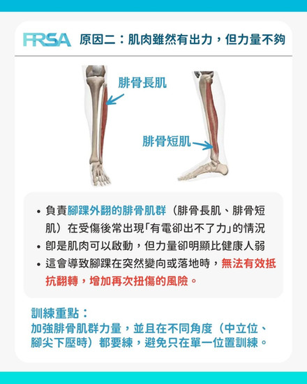 腓骨肌群在受傷後可能無法有效發揮力量,導致腳踝在變向或落地時更容易再次扭傷。